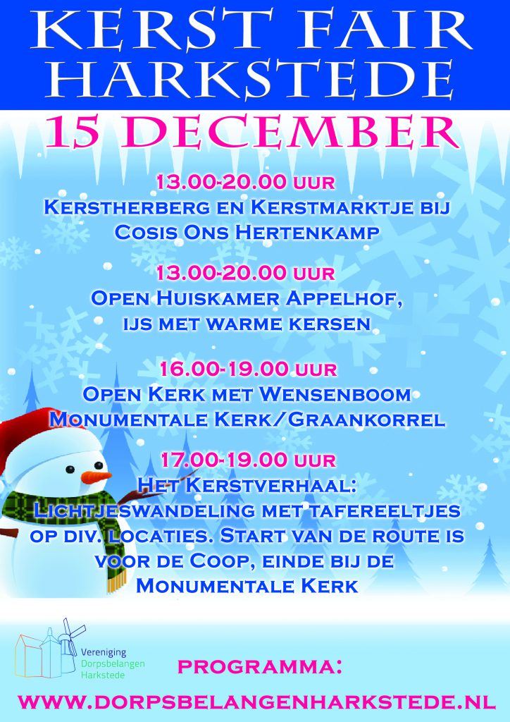 Ook dit jaar is er weer een gezellig Kerstfeest in Harkstede. Met diverse activiteiten voor het hele gezin, jong en oud, op zaterdag 15 december. En natuurlijk met een Kerknachtdienst op Kerstavond maandag 24 december.