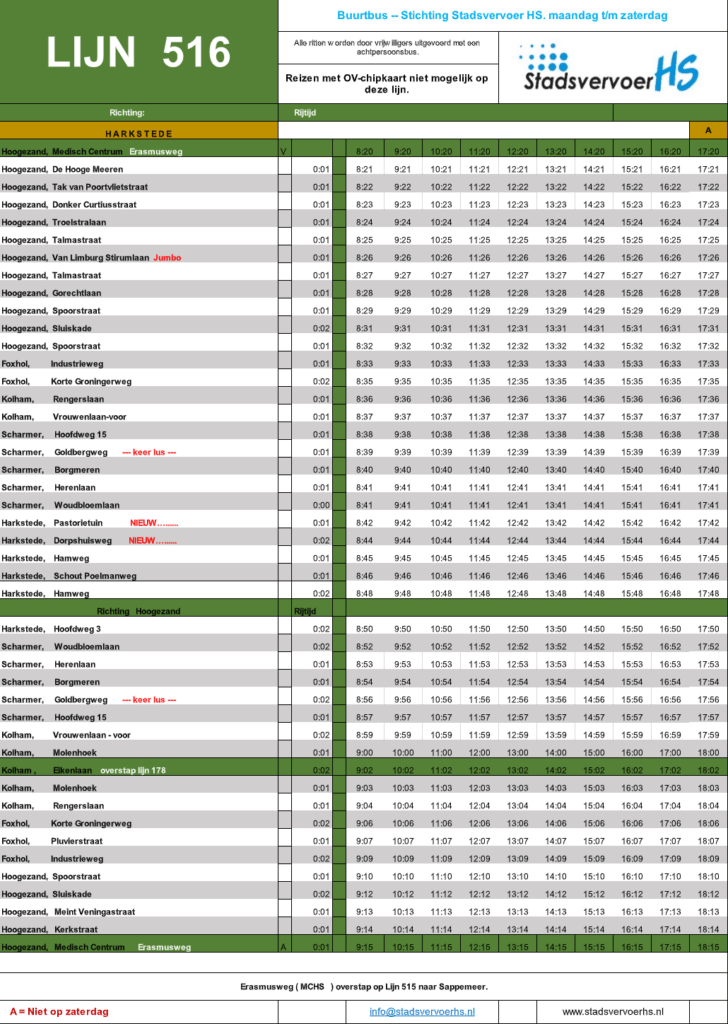 U kunt de website www.stadsvervoerhs.nl raadplegen voor meer informatie en dienstregelingen. Ook zullen de dienstregelingen op diverse andere openbaar toegankelijke plaatsen (bijvoorbeeld supermarkten en ouderen woonzorgcentrums ed.) zichtbaar worden geplaatst.