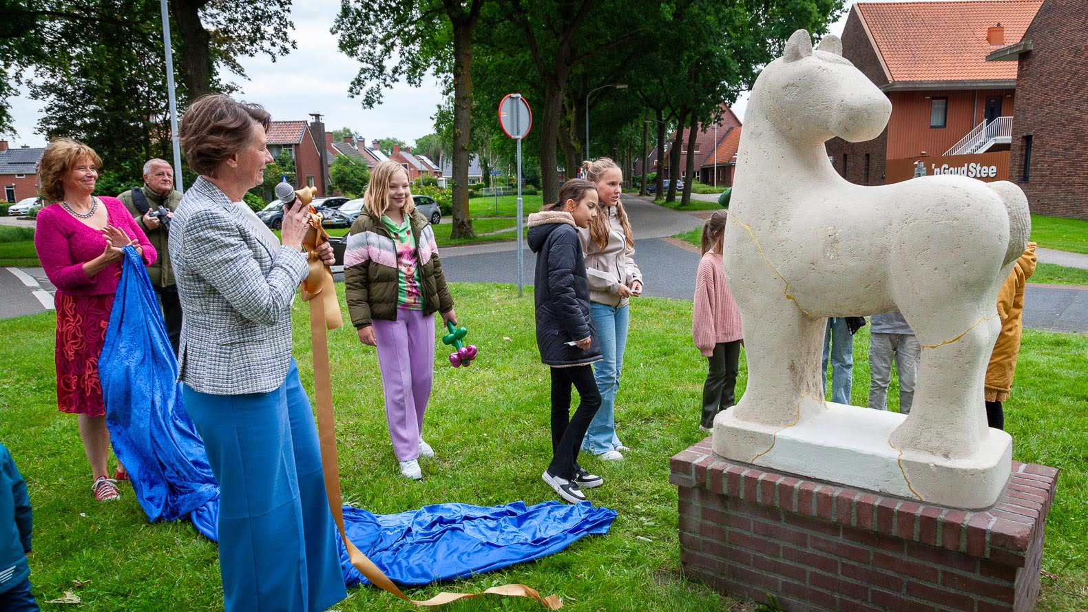 Door Iris bij onthulling gerepareerd paard van Jef in Harkstede
