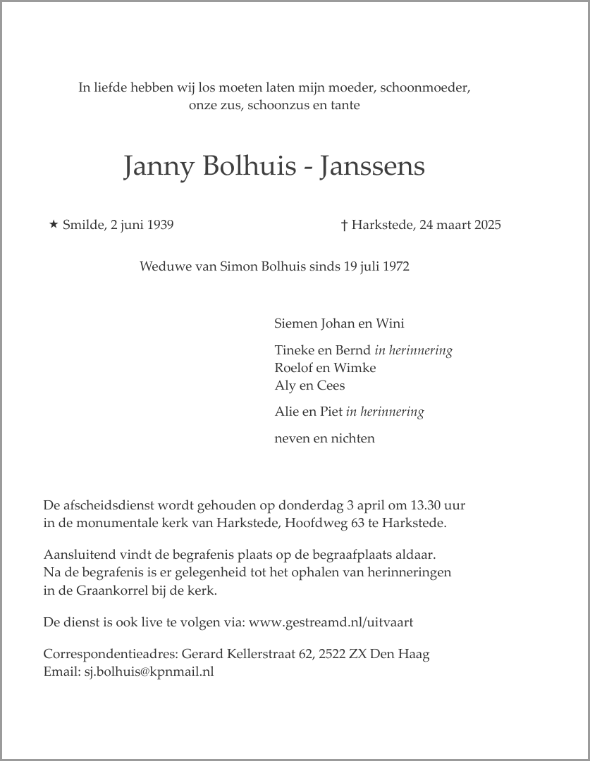 Woensdag bereikte ons het droevig bericht dat Janny Bolhuis is overleden.