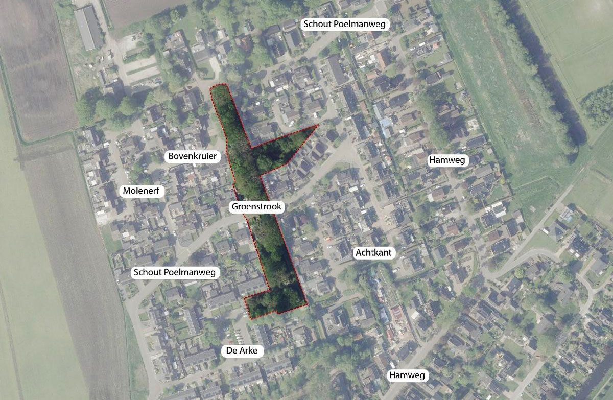 Tijdens twee bijeenkomsten in 2022, waar bewoners aan deelnamen (voor meer informatie, zie het Dorpsplan op onze website), kwam onder andere naar voren dat er een behoefte is aan speel- en ontmoetingsplekken voor alle leeftijden in de wijk. Het project Molenheem richt zich daarom op spelen en ontmoeten in de wijk door middel van een herinrichting van de groenstrook ten westen van de Achtkant (zie onderstaande afbeelding).