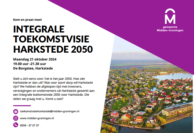 Stelt u zich eens voor: het is het jaar 2050. Hoe ziet Harkstede er dan uit? Wat voor soort dorp wil Harkstede zijn? We hebben de afgelopen tijd met inwoners, verenigingen en ondernemers uit Harkstede gewerkt aan een Integrale toekomstvisie 2050 voor Harkstede. Die delen we graag met u. Komt u ook?