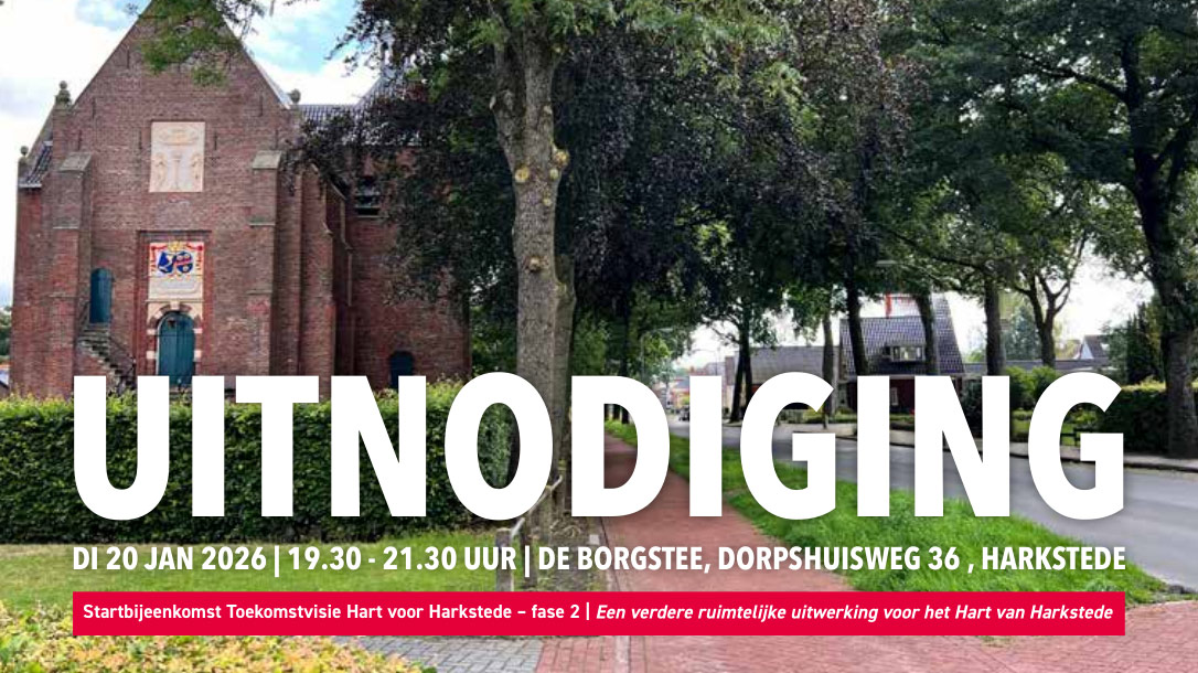 Vanwege de feestdagen ontvangt u de uitnodiging voor de Startbijeenkomst Toekomstvisie voor Harkstede – fase 2 volgende week in de brievenbus. Daarom brengen wij u nu alvast langs deze weg op de hoogte.