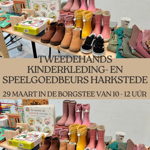 Tweedehands Kinderkleding- en speelgoedbeurs Harkstede Na een mega succesvolle beurs afgelopen november organiseren wij zaterdag 29 maart van 10 uur tot 12 uur weer een tweedehands kinderkleding beurs. Ook deze